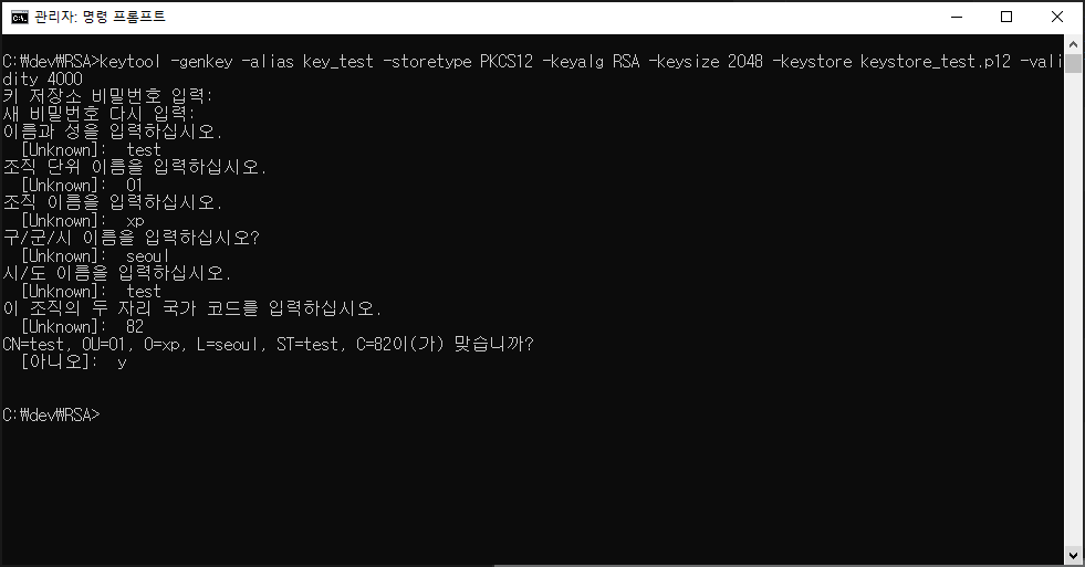 keytool -genkey -alias key_test(별칭) -storetype PKCS12 -keyalg RSA -keysize 2048